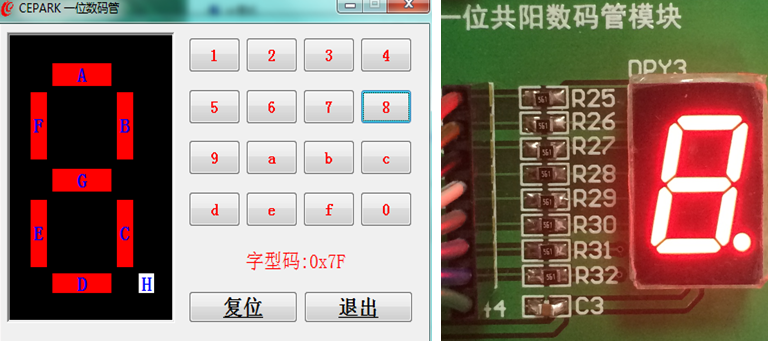 实验现象: 打开上位机软件,打开相应串口,注意串口号要选对,注意晶振为11.0592M, 点击打开8位数码管界面, 点亮上位机上对应段,底板上8位数码管对应的段也被点亮。