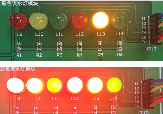 实验现象:6个彩色LED灯依次点亮,之后同时亮灭