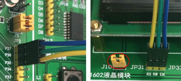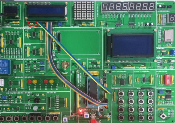 液晶连接:将1602液晶插到底板1602液晶插座上,注意液晶方向,1602液晶的1脚插到底板液晶接口的1脚,液晶16脚插到底板液晶接口的16脚。
