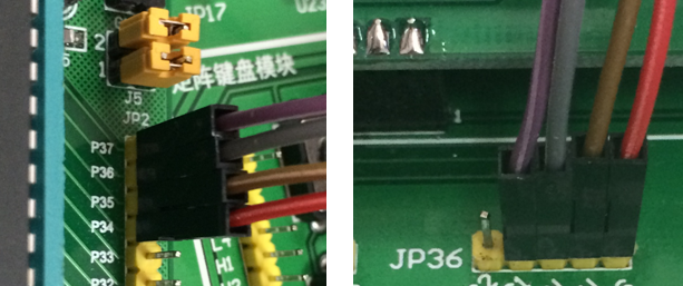 用2根2P杜邦线将单片机P34~P37口与底板JP36相连。