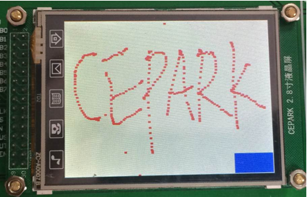 实验现象:复位后,屏幕背景色为白色,右下角有一个矩形蓝色区域,可以做扩展用,例如显示坐标等。用手在屏幕上画图,红色显示画过的线条。
