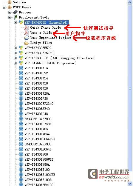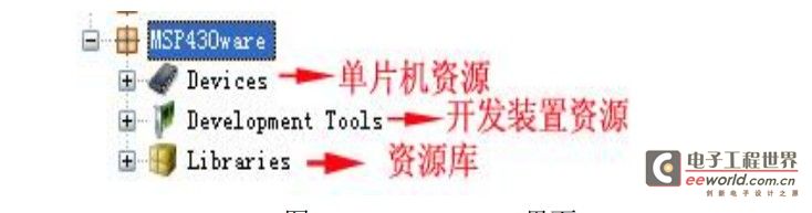 (4)如下图所示,展开MSP430ware,其包含三个方面内容:MSP430单片机资源、开发装置资源以及MSP430资源库