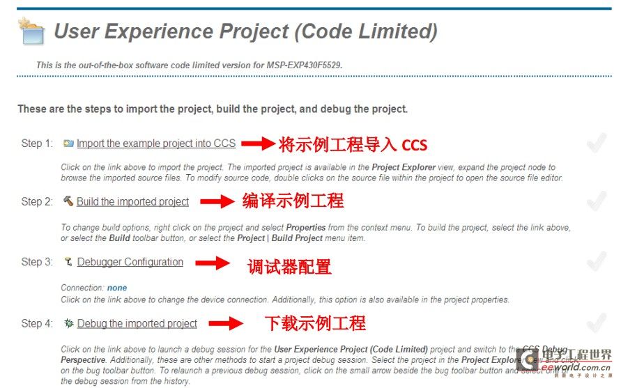 (8)单击User Experience Project 在右面窗口中将得到如图2.37所示窗口。示例程序导入步骤分为四步,在保证开发板仿真器连接正确的前提下(在此利用开发板内置仿真器),单击第一步,将示例工程导入CCS,您将在资源浏览器中,看到导入的工程:MSP-EXP430G2 User Experience,并且第一步和第三步后面蓝色的对号变亮。单击第二步,对示例工程进行编译,编译完成后,将发现第二步后面蓝色的对号变亮。单击第四步,将示例工程下载到开发板。