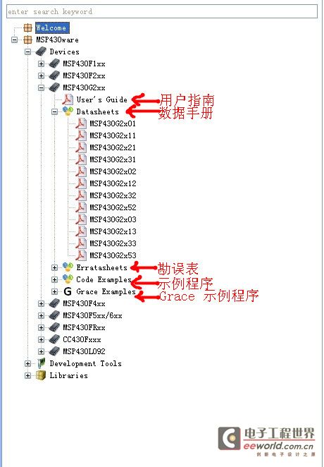(5)展开MSP430单片机资源,得到如下图所示的界面,展开MSPG2XX,其中包含G2系列的用户指导、数据手册、勘误表以及示例代码