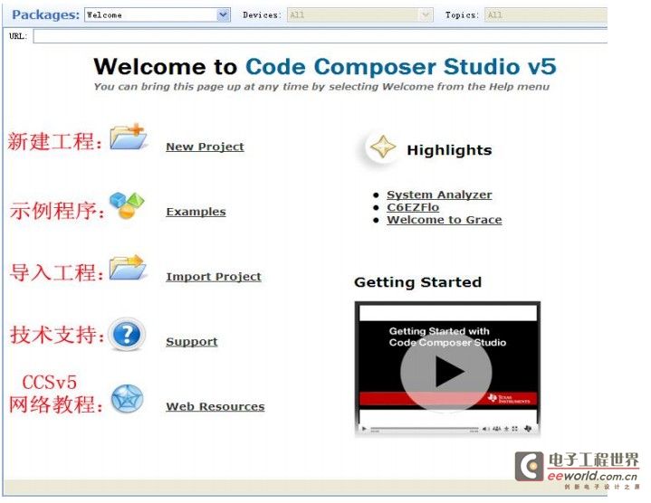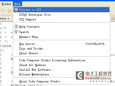 (1)安装好CCS并打开,可以通过Help-->Welcome to CCS 来进入 CCS的资源管理器,如下图。
