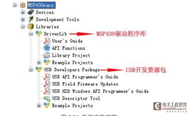 (9)展开Libraries资源库,得到如图2.38所示的界面,其中包含MSP430驱动程序库以及USB的开发资源包。―MSP430驱动程序库‖为全新高级API,这种新型驱动程序库能够使用户更容易地对MSP430硬件进行开发。就目前而言,MSP430驱动程序库可支持MSP430F5xx和6xx器件。MSP430USB开发资源包包含了开发一个基于USB的MSP430项目所需的所有源代码和示例应用程序,该开发资源包只支持MSP430USB设备