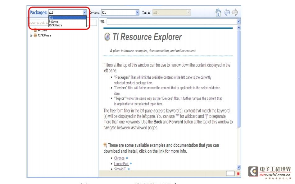 (3)在―Packages下拉菜单下选择ALL,进入CCSv5.1资源管理器,如下图所示。在左列资源浏览器中,包含MSP430Ware。MSP430Ware将所有的MSP430MCU器件的代码范例、数据表与其他设计资源整合成一个便于使用的程序包;基本上包含了成为一名MSP430 MCU专家所需要的一切。