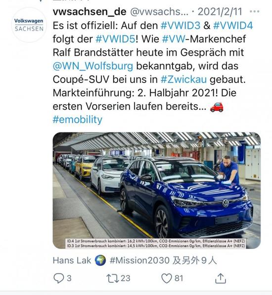 大众通过Twitter发文宣布了即将上市的新车ID.5电动轿跑SUV。