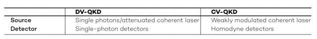 利用量子光的微粒或波的相关方法来产生秘钥。第一种方法是单光子离散变量QKD (DV-QKD):信息是基于极化和其他量子参数进行编码的。第二种方法是连续可变QKD (CV-QKD):信息是根据作为发射器的相干激光器的振幅和相位进行编码的,由接收器测量参数。