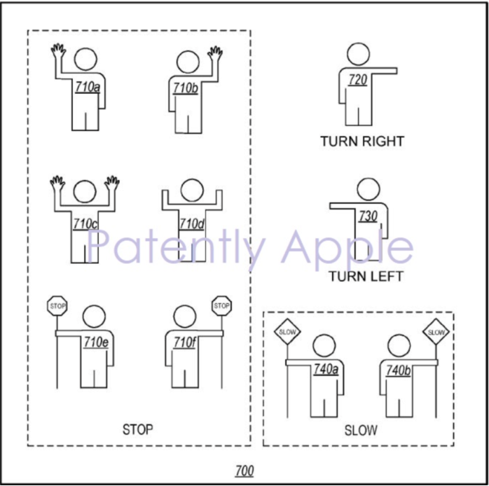在对行驶道路环境的信息采集上,苹果可谓是考虑的十分周到。甚至临时交通指示都考虑进去了,比如遇到交通信号灯出问题,或者无交通信号灯,由交警指挥交通时,苹果申请的“Traffic Direction Detection Recognition”专利中,提到了一项识别交警手势并因此对车辆行驶路径改变的技术。