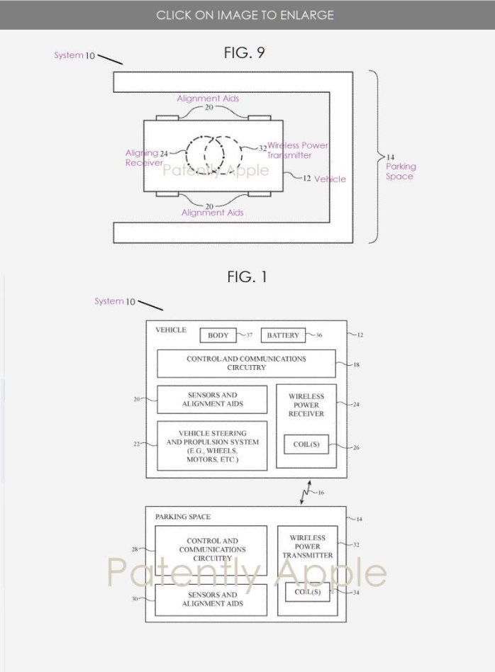 其中一个专利提到了无线充电技术,核心在于该技术通过无线充电站的传感器来使得车辆自动泊入合适位置,便于最高效率充电。