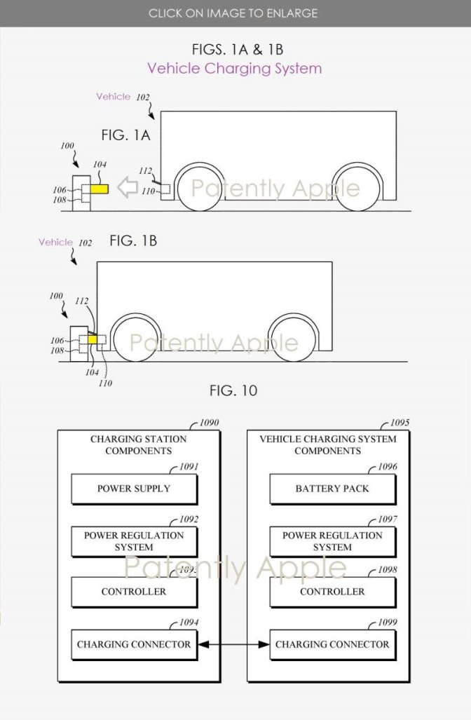 而另一个名为“Charging station with passive alignment mechanism”则是提到了苹果自动有线充电桩技术,即车辆可在系统帮助下或者自动泊入充电位置,直接连接有线充电桩,从而使得车辆充电过程不再需要人为操作即可完成。