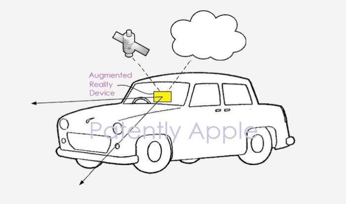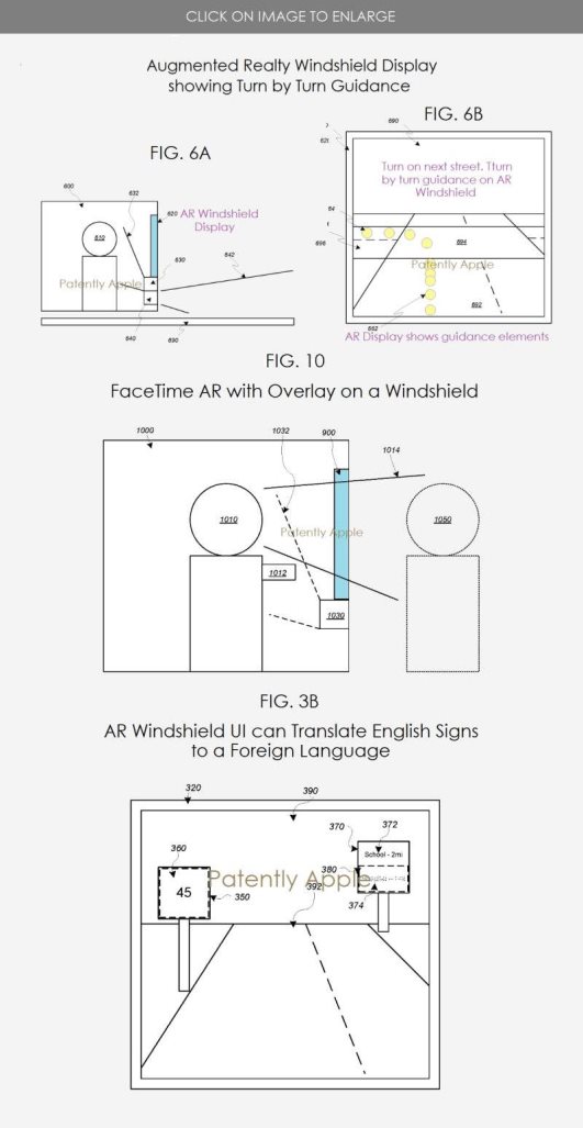 例如近些年一直传言的AR技术,很可能首先应用于苹果电动汽车。在诸多专利中,关于AR在汽车中的应用有很多,例如在前挡风玻璃上(自定义调节区域、位置、信息内容、显示方式等)融合实际道路实现地图和导航功能、基于保护隐私的同时能够在四周车窗上显示实际周围环境(或者实现娱乐、视频电话等功能)。