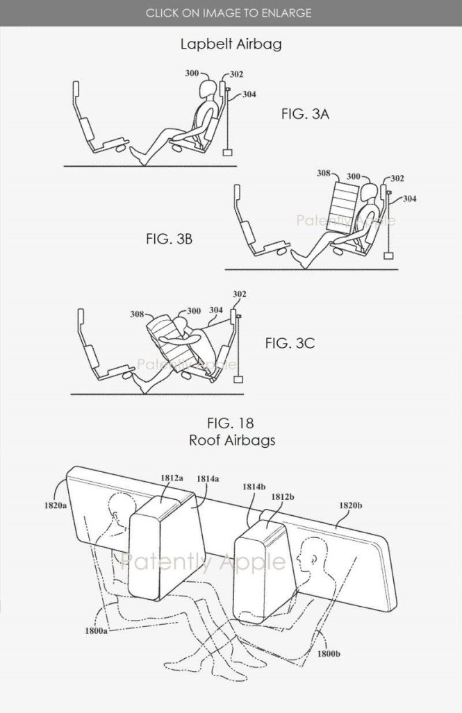 比如在纯交通工具式的自动驾驶车辆中,由于乘客都是对坐模式,没有传统的结构储藏安全气囊等设备,所以苹果将安全气囊整合到安全带以及车顶,以保证乘客的安全。