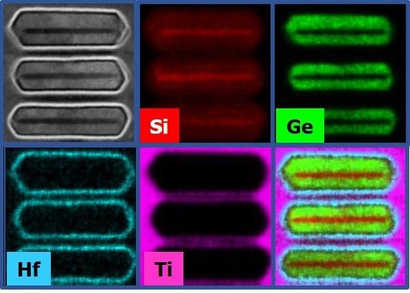 图3:沿栅极柱M1外延生长4 nm厚的Si 0.65 Ge 0.35的堆叠SiGe NSs沟道的截面STEM图像和EDX元素图。Wsheet = 40nm。资料来源:IBM