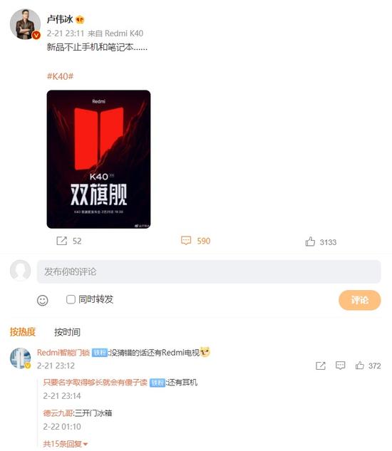 昨晚,小米集团副总裁、中国区总裁、红米 Redmi 品牌总经理卢伟冰发布微博表示:发布会新品不止手机和笔记本。