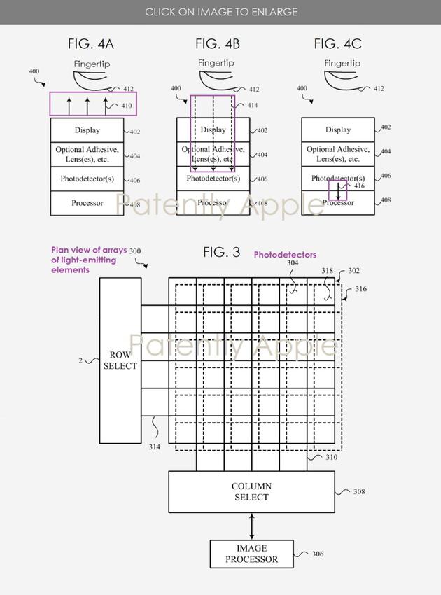 专利中指出,光电传感器阵列可以用来探测指纹、掌纹甚至进行 3D 面部或者视网膜扫描。如果这项专利可行,有望消除或缩减 iPhone 目前的大刘海。