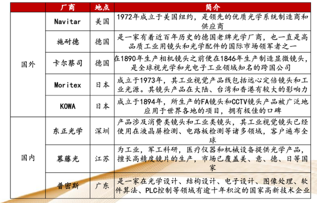 镜头镜头相当于人眼的晶状体,是机器视觉采集和传递被摄物体信息过程的起点,所使用的的镜头为工业级镜头。根据赛迪顾问数据,2019年全球工业镜头市场规模约为12亿美元、中国约为7亿人民币,从增速来看,国内增速远高于全球增速。国内外镜头主要企业: