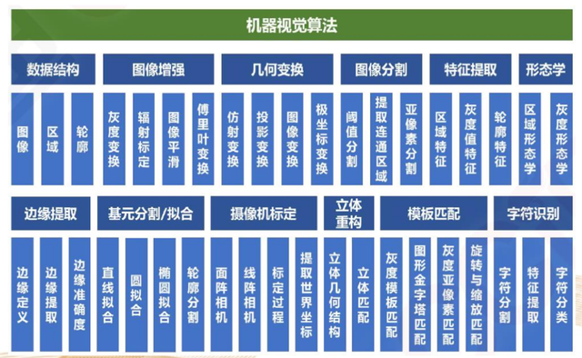 机器视觉中游是产业链核心环节,包括部件制造和成套系统集成两个环节。国内厂商在集成端发展迅速,尤其是在一些外资还没有布局的领域、或者非标自动化领域如3C等。国内集成厂商单纯进行二次开发利润空间较小,在某一行业下游完成良好布局之后,会尝试逐步向上游底层开发延伸,进行核心软硬件的进口替代。机器视觉开发工具主要有两种类型,一种是包含多种处理算法的工具包,另一种是专门实现某一类特殊工作的应用软件。软件算法方面,车内凌云、海康、大恒、奥普特都已具备开发底层算法的能力。视觉控制系统-机器视觉算法是工业机器视觉的灵魂: