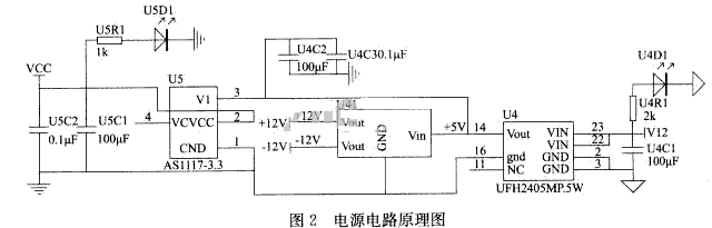 本系统需要使用+5V和+3.3V的直流稳压电源,其中MSP430Fl49及部分外围器件需要+3.3V电源,另外部分需要+5V电源。在本系统中,以+5V直流电压为输入电压,+3.3V由+5V直接线性降压。电源电路原理如图2所示。