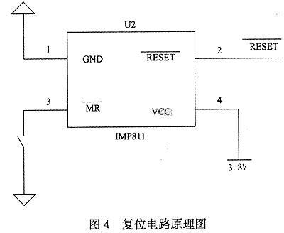 手动复位是最小系统常用的功能,本系统采用专用复位芯片IMP811实现手动复位,原理如图4所示。