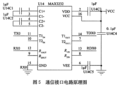 本系统采用专用电平转换芯片MAX3232来实现。MAX3232芯片是MAXIM公司生产的电平转换芯片,包含两路接收器和驱动器,性能可靠。原理如图 5所示。