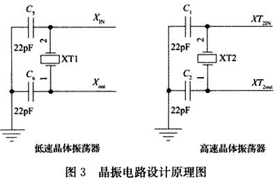 低速晶体振荡器(LFXTl)满足了低功耗及使用32.768kHz晶振的要求。LFXTl振荡器默认工作在低频模式,即32.768kHz,也可以通过外接450kHz~8MHz的高速晶体振荡器或陶瓷谐振器工作在高频模式,在本电路中我们使用低频模式,晶振外接2个22pF的电容经过XIN和XOUT 连接到MCU。