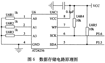 数据存储选择大容量的E2PROMCAT24WC256。它是一个256K位串行CMOSE2PROM,内部含有32768个字节,每字节为8位,CATALYST公司的先进CMOS技术减少了器件的功耗,CAT24WC256有一个64字节页写缓冲器该器件通过I2C总线接口进行操作。原理如图6所示。