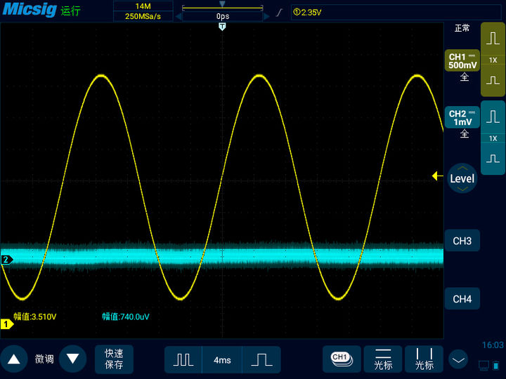 此时通道一的垂直档位为500mV/div,幅值是3510mV。通道二的垂直档位为1mV/div,幅值是0.74mV。