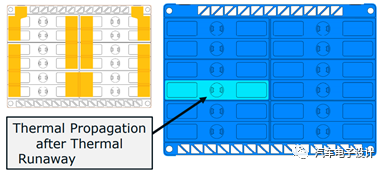喷发物控制:方壳电芯有小一半的热量是通过喷发物排出来的,所以在电池系统里面需要设计完善的排烟通道并且把喷发物和其他电芯进行隔离