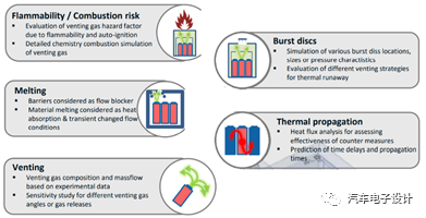 研究仿真还原的是电芯在喷发气体的危害因素,在排气过程中气体成分、质量和流量,研究不同的泄压阀位置和内部的效果;当然我们最关注的还是电芯热失控过程中的时间传播延迟性还有对于加入隔热材料等措施的有效性。