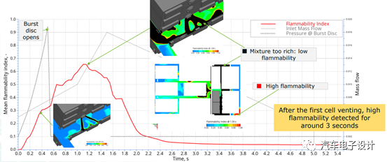 热失控过程中释放出来的气体包含H2,CO,CH4,DMC和其他(在某些情况下为有毒的)成分,这样的混合气体高度易燃。 在整包仿真中的意义是考核烟气隔离盖、泄压阀数量&位置和排气通道的设计优化。