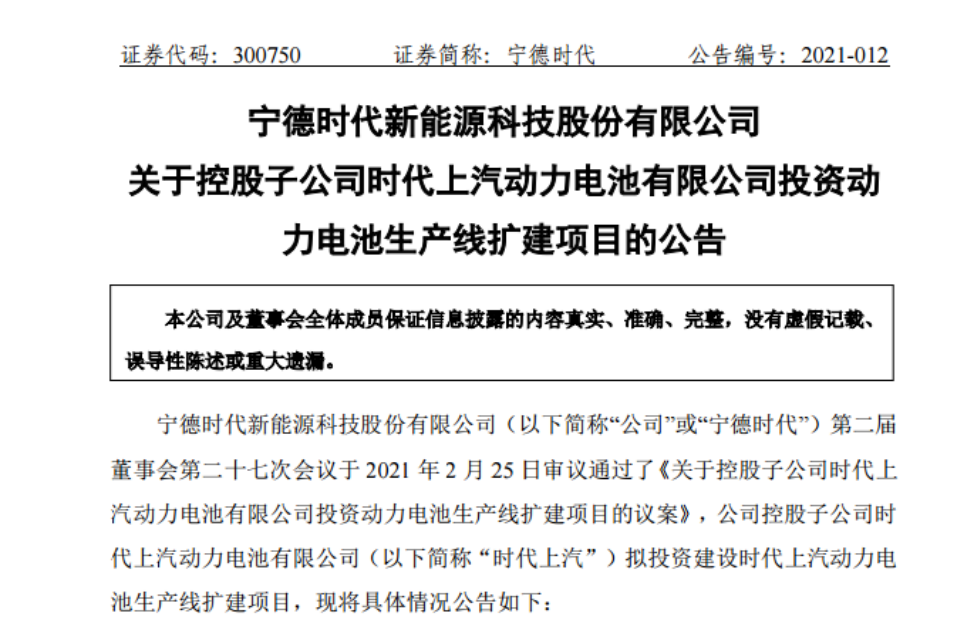 2021年02月26日 | 宁德时代拟不超过105亿元投建动力电池生产线扩建项目
