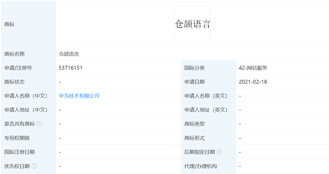 2021年02月26日 | 华为申请注册了“仓颉语言”商标