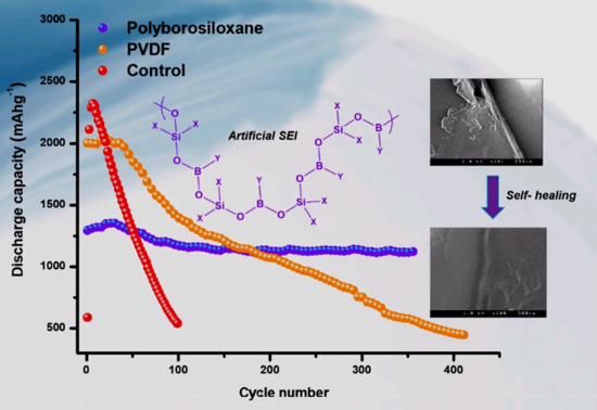 与裸露的硅阳极和涂有聚偏氟乙烯(LIB中的一种商用涂层)的阳极相比,PBS的自愈性及其对锂离子的可逆调节显著提高了稳定性。部分原因是PBS能够填充SEI在运行期间形成的所有裂缝。与上述阳极不同,PBS涂层硅阳极的容量在300多次循环中几乎保持不变。