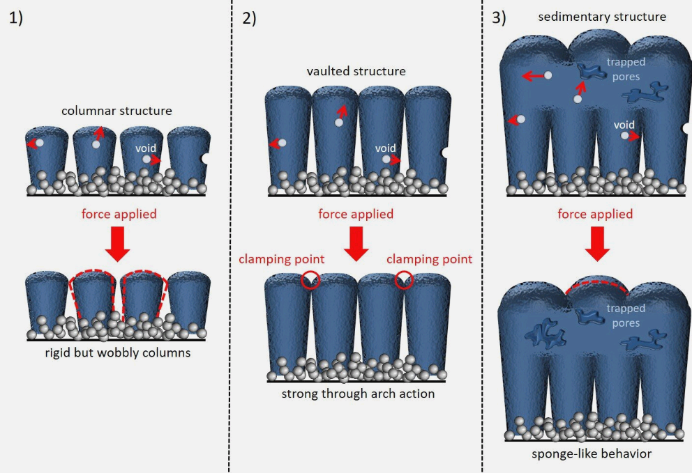 新的研究解释了在一个临界厚度处刚度突然增加的原因。通过显微镜技术和原子水平的计算机模拟,研究人员发现,当硅原子沉积在纳米颗粒层上时,它们不会形成均匀的薄膜。相反,它们形成了倒锥状的柱,随着沉积的硅原子越来越多,柱越来越粗。最终,单个硅柱相互接触,形成拱形结构。