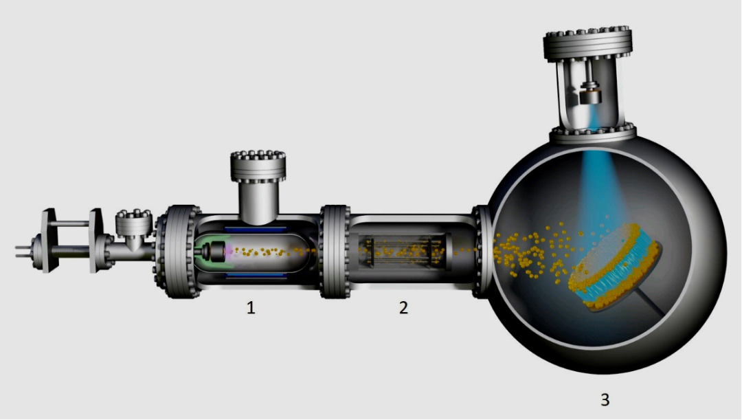 图:腔室1,生长由钽金属制成的纳米颗粒,单个钽原子聚集在一起,类似雨滴;腔室2,对纳米粒子进行质量过滤,去除过大或过小的纳米粒子。腔室3,沉积一层纳米颗粒,然后用孤立的硅原子“喷射”,形成硅层。重复此过程以创建多层结构。