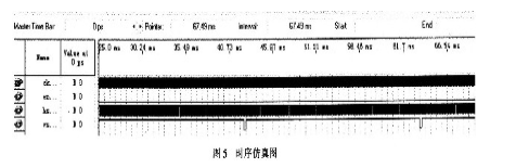 采用FPGA内置的锁相环IP模块(PLL)将FPGA 50 MHz时钟信号F_CLK 10分频为5 MHz的像素时钟信号。应用状态机方法,用Verilog硬件描述语言设计时序控制模块,它为LCD提供满足时序要求的控制信号VSYNC、HSYNC以及ENAB。设计完成后在QuatuslI环境下完成时序仿真,得到的仿真结果满足时序要求,仿真图如图5所示。