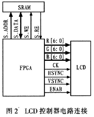 由于SRAM有较高的读写速度,该设计方案的显示缓存采用1片IS61LV51216AL型SRAM,其容量为512 KB,读写速度为10ns左右。而显示一帧图像的大小为125 KB(320x240x2/l024),FPGA对显存的读写速度约为200 ns,因此满足系统要求。图2为LCD控制器电路连接图。