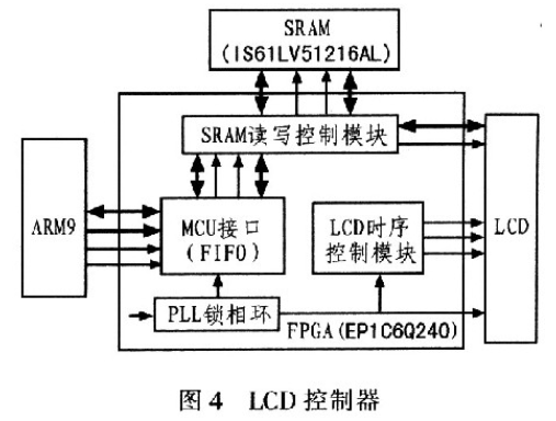 系统的工作流程:在FPGA内部的时序发生电路所产生的时序控制信号作用下,LCD控制器通过Framebuffer接口从微控制器读出显示所需的数据存入显示缓存SRAM中。同时LCD显示屏从显存SRAM中读取显示数据,并通过数据格式转换电路直接将数据信息实时显示。
