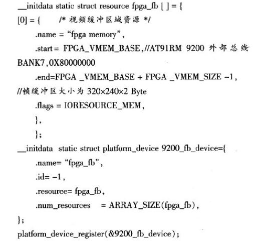 1)资源申请 系统中,9200通过外部总线接口的BANK7与FPGA FIFO接口连接,采用16位静态总线方式对FIFO数据进行写入操作。根据驱动设计框架,驱动程序设计的第一步需要通过系统调用platform_device_register函数申请总线资源,示意代码如下: