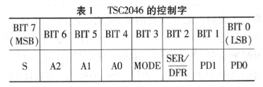 TSC2046可设置为8位或12位工作模式,输入方式为差分输入和单端输入,本文以12位差分输入模式进行说明。表1为TSC22046的控制字。