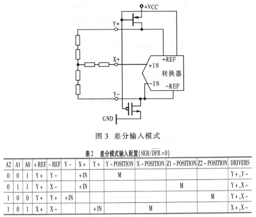 其中S为数据传输起始标志位,该位恒为“1”。A2~A0用于通道选择,决定触摸屏体输出模拟电压从TSC2046的哪个引脚输入。MODE用于选择A/D转换的精度,当为1时选择8位;当为0时选择12位。在12位工作模式下,其二进制结果的最低位表示模拟电压为参考电压(TSC2046引脚+VCC与GND的压差)的1/4 096。SER/DFR可用于选择输入模式,SER选择单端模式,DFR选择差分模式。PD1、PD0用于选择省电模式。图3为差分输入模式下的示意图。表2是差分模式输入配置。差分模式是一种比率度量转换方式,加在触摸屏体电极上的电压为TSC2046引脚+VCC与GND之间的电压,转换结果是触摸屏上分布电阻值的百分比。