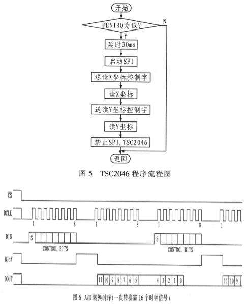 TSC2046驱动程序的流程如图5所示。图6为A/D转换时序(一次转换需16个时钟信号)。