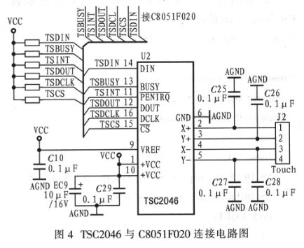 TSC2046与C8051F020的电路连接图如图4所示。触摸屏体两对儿电极通过J2接至TSC2046的四个电极。为了增强驱动能力,TSC2046与C8051F020的连线均通过一只10 kΩ的上拉电阻拉至5 V,采用SPI接口通信,相关引脚对应关系:TSDIN-数据输入、TSBUSY-忙信号、TSINT-笔中断信号、TSDDOUT一数据输出、TSDCLK一时钟信号、TSCS一片选信号。TSC2046与C8051F020连接时,