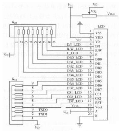 YXD-12864A2LCM是一种图形点阵液晶显示模块,它主要由行驱动器、列驱动器及128x64全点阵液晶显示器组成。可完成图形显示,也可以显示4x8个(16&TImes;16点阵)汉字。YXD-12864A2模块共有20个引脚。其中,第1脚VSS接系统地;第2脚VDD接电源电压;第3脚V0接液晶显示器驱动电源;第4脚D/I接数据指令选择信号;第5脚R/W接读写选择信号;第6脚接读写使能信号,E为高时,数据被读出,而在E的下降沿到来时,数据被锁存到DB0~DB7;第7~14脚接三态数据总线;第15、16脚接片选信号;第17脚接复位信号;第18脚Vout接内部负压发生器输出电压端;第19脚接LED背光电源正极;第20脚接LED背光电源负极。