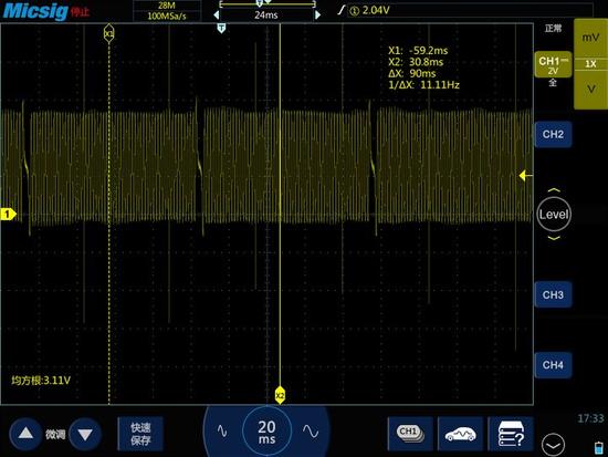 用示波器测量的时候,对通道一链接一根BNC转香蕉头线,黑色香蕉头接一个鳄鱼夹搭铁接地,红色香蕉头线接刺针与传感器信号端子相连。通道衰减比调节为1X,垂直档位调节为2V/div,时基可根据发动机转速适当调节改变。
