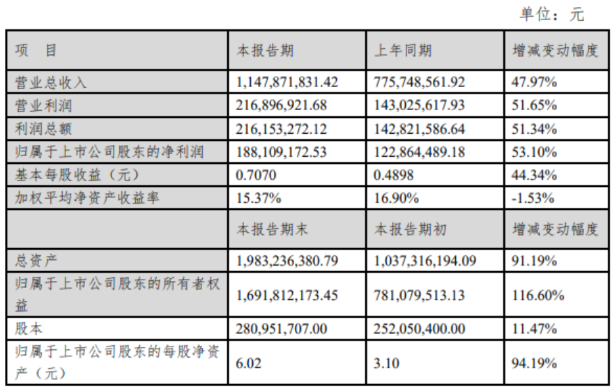 财务方面,报告期末,其总资产金额为19.83亿元,比期初增长91.19%;归属于上市公司股东的所有者权益合计为16.92亿元,比期初增长116.60%;归属于上市公司股东的每股净资产6.02元,比期初增长94.19%。总资产及净资产变动较大主要系本期非公开发行股票取得募集资金816,709,545.27元所致。