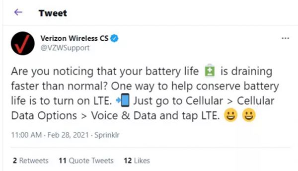 Verizon的支持人员在周日早上的一条推文中给出建议,如果用户发现自己手机的电池耗电比正常更快,那么能帮助节省电池寿命的一个方法就是打开LTE。