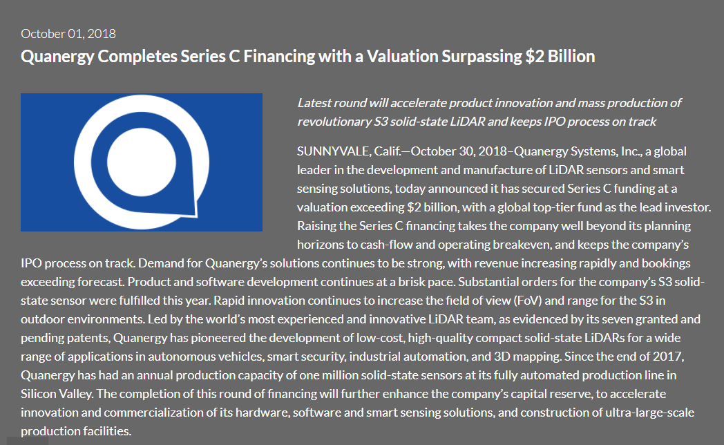 2018年10月,Quanergy宣布完成数千万美元C轮融资